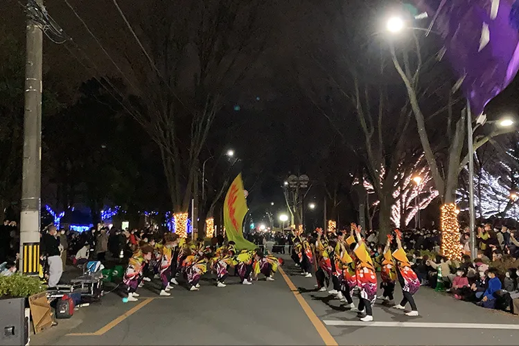 コロナ禍で地域のイベントが中止となる中、クリスマスにはイルミネーションを中心としたイベントが行われ、地元に愛されているよさこいの披露や音楽隊の演奏、飲食店や雑貨店の出店があり、多くの人で賑わった。